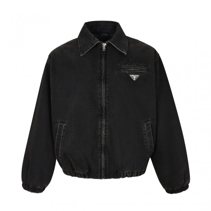 프라다의 상징적인 트라이앵글 에나멜 로고가 가슴 포켓에 새겨진 코튼 덴임 자켓입니다.