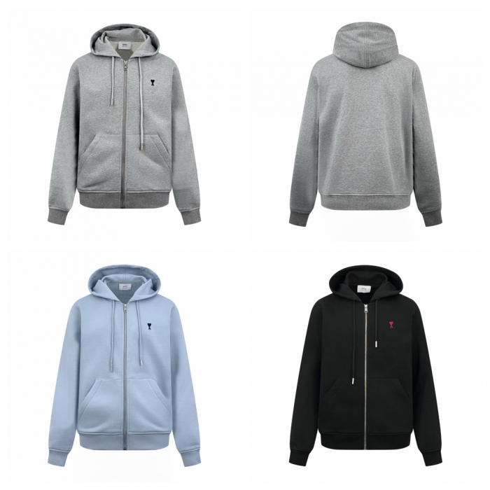 아미의 상징적인 하트 로고 자수가 포인트로 들어간 후드 집업 스웨트셔츠입니다.